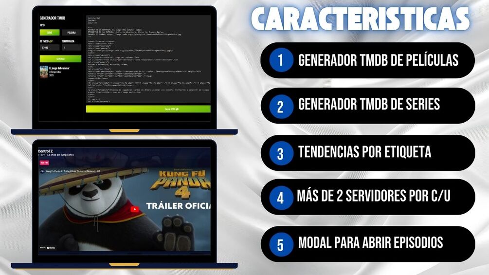 Con el Generador TMDB para Películas y Series, tendrás acceso a una base de datos impresionante que se actualiza automáticamente. Ya sea que tus usuarios busquen nuevas películas o últimas series, este generador asegura que siempre tendrán contenido actualizado en todo momento.